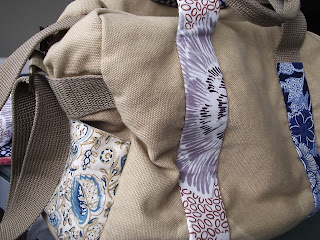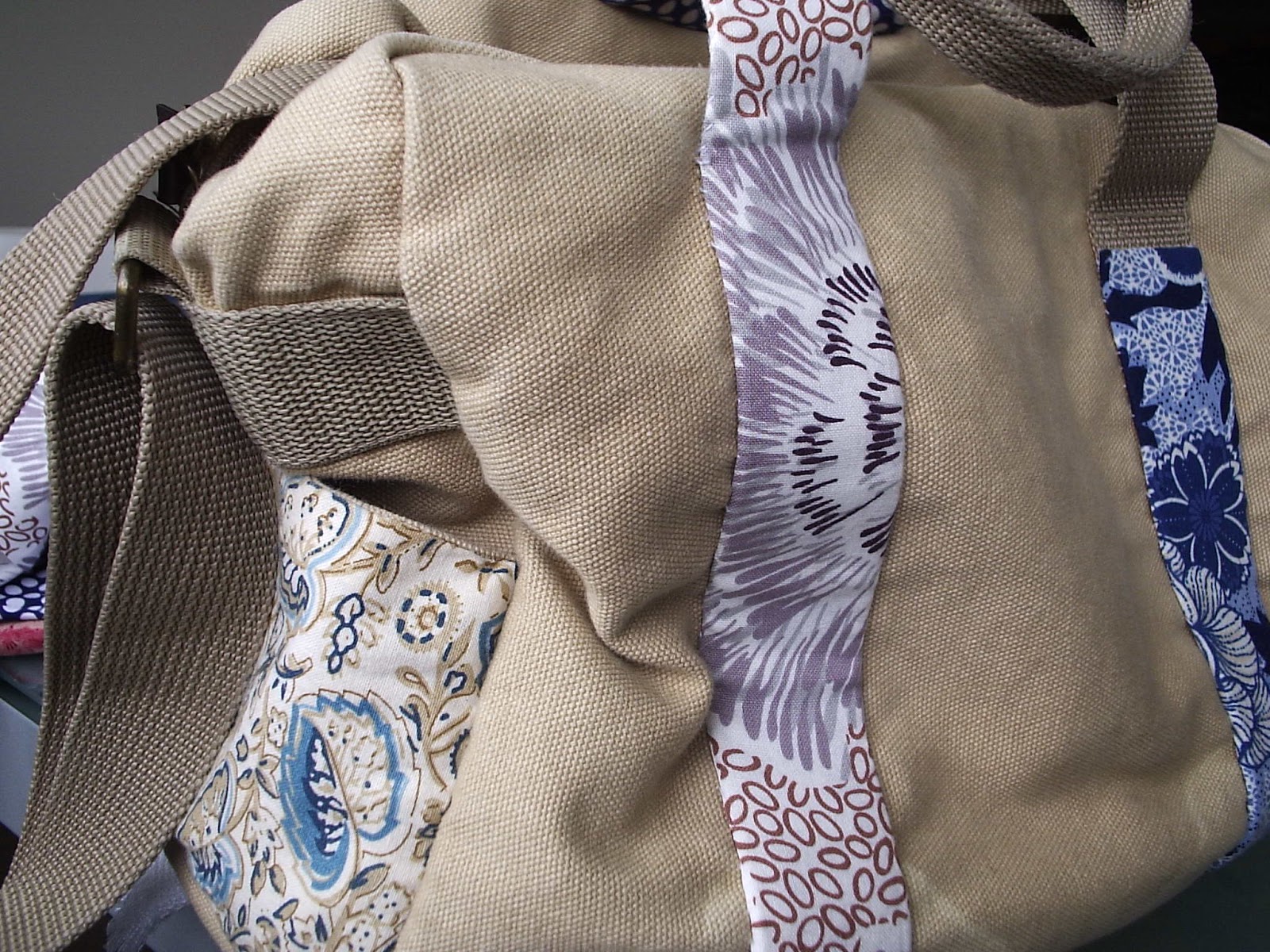 In this piece I raided my fabric box and selected shades of blue combining eclectic patterns to add life to my well loved go-everywhere bag. Sewing these on by hand is rather therapeutic and the end result is both unique and stylish.