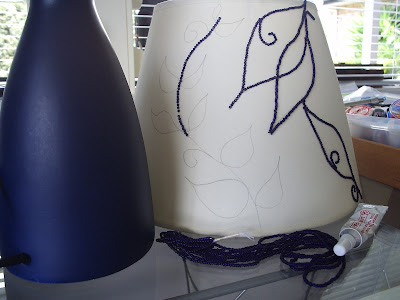 A blank canvas such as this lampshade can be easily transformed with some shiny beads and a sketch. Admittedly I am going blind gluing the tiny cobalt balls in place. However the end result will make it worthwhile.