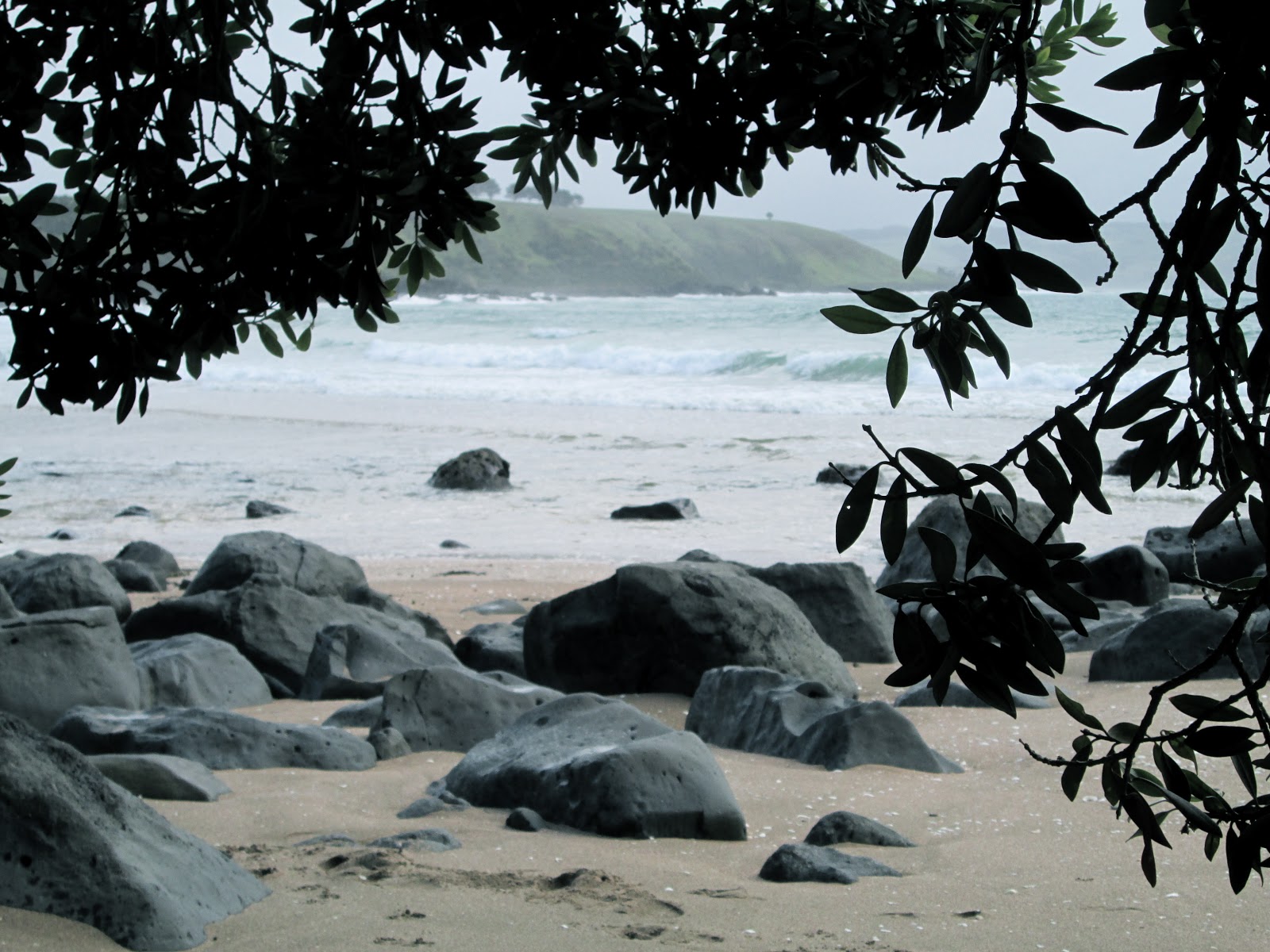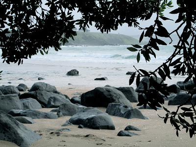 We got caught in the rain today on a walk, rock hopping along the adjoining Bays. Luckily there was a massive pohutekawa to shelter under and we watched the rain and the white horses driving into the beach. What is it about the mix of ocean and weather that makes it so addictive?